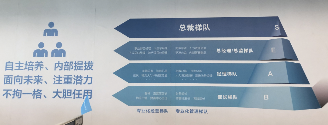 蘇寧主要通過1200校招工程進行人才梯隊培養(yǎng),將人才團隊劃分為B梯隊(部長梯隊)、A梯隊(經理梯隊)、E梯隊(總經理/總監(jiān)梯隊)、S梯隊(總裁梯隊),逐層選拔培養(yǎng),在潤物細無聲中形成了組織的人才梯隊。