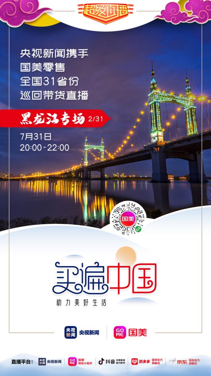 7月31日晚8點(diǎn),“買(mǎi)遍中國(guó)·助力美好生活——央視新聞&國(guó)美零售全國(guó)31省份巡回帶貨直播”第二站將聚焦黑龍江,回眸東北這片熱土。