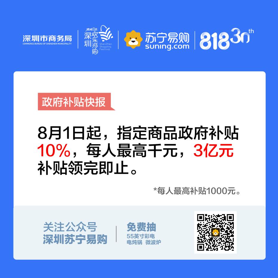 第二屆鵬城八月歡樂游購——深圳家電數(shù)碼消費節(jié)在華強(qiáng)北群星廣場自8月1日起拉開帷幕,已向深圳居民推出3億元家電和數(shù)碼產(chǎn)品補(bǔ)貼政策,用戶按實際購買價格的10%給予補(bǔ)貼,每位居民累計最高補(bǔ)貼1000元?;浉厶K寧電器店及家樂福與大潤發(fā)近3000件商品均可享用。品類覆蓋齊全,商品選擇范圍廣,為消費者帶來一場盛大家電數(shù)碼消費節(jié)的同時為經(jīng)濟(jì)消費做出強(qiáng)有力的貢獻(xiàn)。