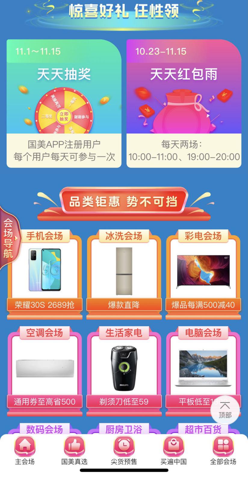 見圳客戶端·深圳新聞網(wǎng)2020年10月29日訊 轉(zhuǎn)眼已經(jīng)到了十月末,11.11狂歡浪潮已然襲來!從本周開始,各大平臺已經(jīng)開啟購物狂歡。本次國美“11.11”大促活動時間由10月23日開始,一直持續(xù)到11月15日,整個狂歡節(jié)全程囊括了“國美真選”、“九九會員”、“買遍中國超級直播”、“飛天茅臺酒”等眾多板塊活動內(nèi)容。另外,還有每日簽到、抽獎、紅包雨、拼購等互動搶福利玩法,一大波好物好玩等你圍觀,絕對滿足你薅羊毛、低價搶好物的期待。今年如何玩轉(zhuǎn)11.11?給您安排上!