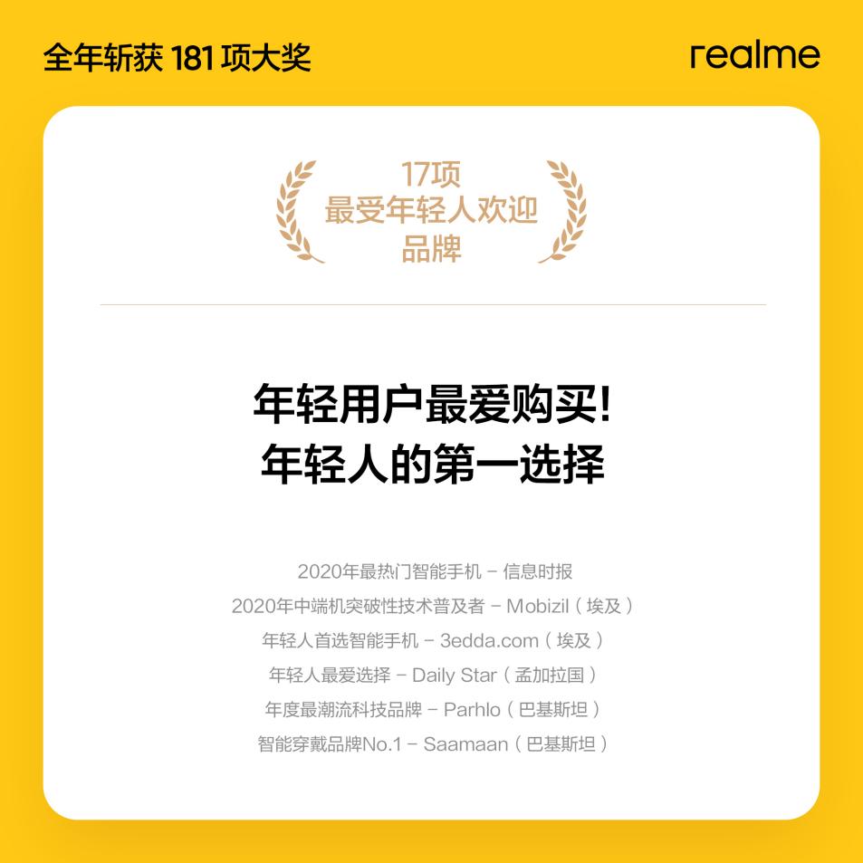 自創(chuàng)立以來(lái),realme一直面向年輕用戶群體,基于對(duì)年輕人審美與偏好的精準(zhǔn)洞察與理解,不斷滿足和超越年輕科技愛好者的需求,這一策略在東南亞、南亞、歐洲、非洲等市場(chǎng)獲得極大認(rèn)可。2020年,全球給予realme“年輕人最喜愛品牌”等相關(guān)獎(jiǎng)項(xiàng)達(dá)17項(xiàng),用實(shí)力證明realme是“年輕人第一選擇”。同時(shí),realme一舉網(wǎng)羅全球各大產(chǎn)品獎(jiǎng)項(xiàng),充分證實(shí)了“好產(chǎn)品會(huì)說(shuō)話,產(chǎn)品才是硬實(shí)力”這句被商界奉為圭臬的卓見。