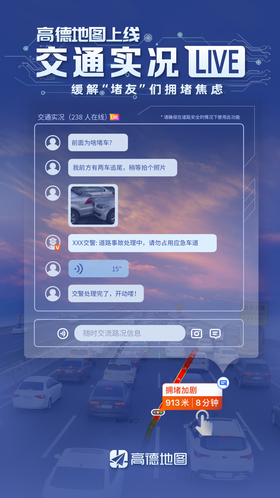根據(jù)高德地圖的調(diào)研分析,遇到堵車時(shí),46%的司機(jī)最關(guān)心還會(huì)堵多久,36%的司機(jī)最想知道擁堵原因。隨著擁堵時(shí)間變長,人們的關(guān)注點(diǎn)會(huì)轉(zhuǎn)移到擁堵處理進(jìn)度上,比如交警是否到場,事故是否解決等。但由于交通擁堵多為臨時(shí)性偶發(fā),此前沒有一個(gè)權(quán)威的信息平臺(tái)可以解答這些疑問。