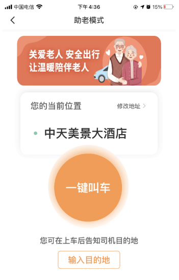 打開萬順叫車APP、小程序,醒目的助老模式按鈕,按下一鍵叫車大按鈕就能呼叫萬順叫車,無需輸入目的地,簡化繁瑣叫車流程。