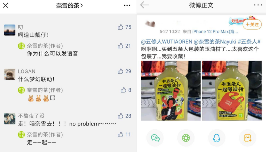 這樣“肆意妄為”的話從五條人嘴里蹦出并不稀奇,他們與生俱來(lái)的“平凡生活浪漫主義”,擅長(zhǎng)洞察事物的另一面。精妙的是,奈雪的茶洞察到用戶在日常生活中的種種焦慮,將霸氣玉油柑“先澀后甜”的特點(diǎn)比作人生滋味,用這一豁達(dá)積極的態(tài)度來(lái)輕松正能量地引導(dǎo),這一點(diǎn)與五條人的精神內(nèi)核如出一轍。5月27日奈雪的茶X五條人TVC發(fā)布后,不少網(wǎng)友表示這波是“破次元壁”的夢(mèng)幻聯(lián)動(dòng),還有網(wǎng)友在線分享五條人歌曲中有共鳴的歌詞。