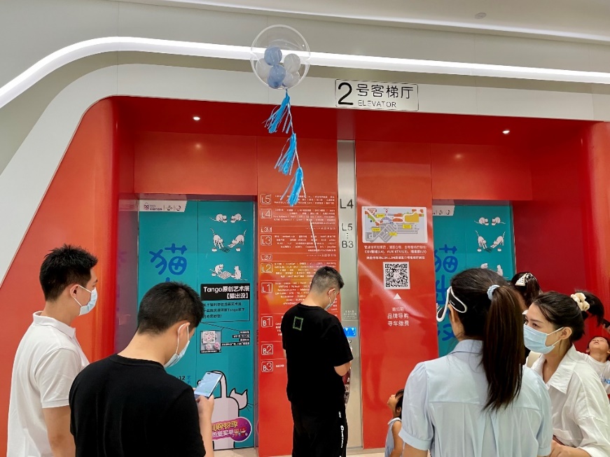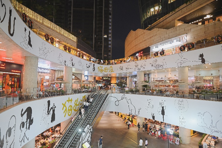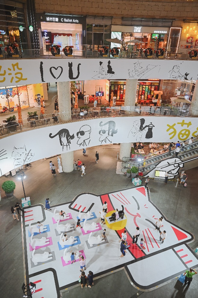 以壹方城為大型展廳,打造巨型貓瑜伽互動點(B1中心廣場)及巨型漫畫打卡墻 (小米通道前 ),全場還閃現(xiàn)各種創(chuàng)意貓貓漫畫貼紙,包括玻璃圍欄、店鋪櫥窗、電梯門,甚至是小小垃圾桶也有細節(jié)設計,沉浸式的“吸貓”逛展體驗,讓人獲得滿滿療愈之感。不得不說,貓出沒 ·tango藝術特展實屬匠心之作,氛圍感和體驗感極佳。