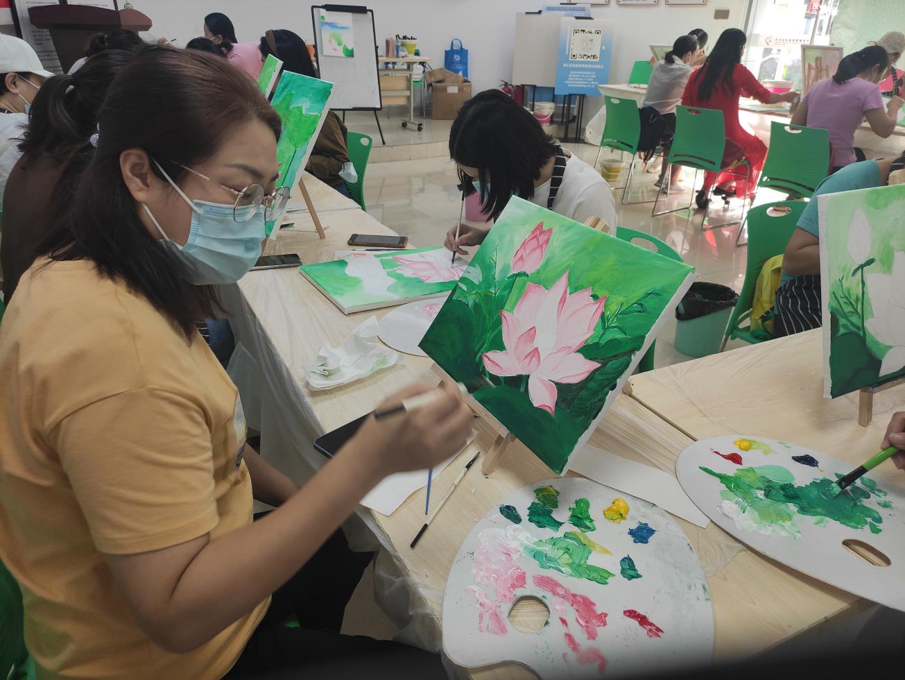 全職媽媽,這個(gè)平凡而偉大的群體,操持家務(wù)、陪伴孩子、全年無休,為此犧牲了自己的興趣愛好,交際圈、經(jīng)濟(jì)收入。大汪山社區(qū)關(guān)注媽媽身心健康,以“油畫”搭建平臺(tái),為全職媽媽們創(chuàng)造減壓、專注、有趣的“個(gè)人時(shí)間”。在這里,媽媽們暫時(shí)放下孩子的作業(yè)、未洗的衣服、未做的晚飯,專注于和畫筆、顏料、畫友相處的時(shí)間:油畫基礎(chǔ)、畫面結(jié)構(gòu)、色彩調(diào)配、色彩層次……