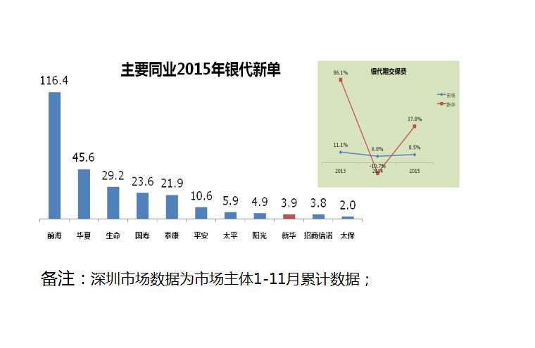 市場排名:2012-2015年,新華深分銀代期繳保費年平均增長率23%,市場同期增長率為6%,銀代新單規(guī)模排名深圳市場第九。