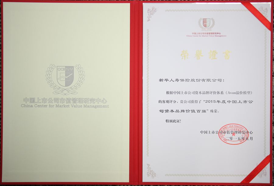 2015年5月,中國上市公司市值管理研究中心發(fā)布的”2015年度中國上市公司資本品牌價值百強“中,新華保險赫然上榜!