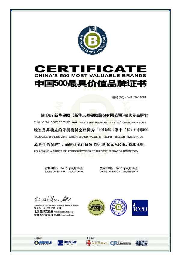 世界品牌實(shí)驗(yàn)室(World?Brand?Lab)發(fā)布2015年(第十二屆)《中國500最具價值品牌》排行榜。新華保險品牌價值為268.16億元,同比提升逾40億元;位居榜單第88名,比去年晉升3位,連續(xù)三年穩(wěn)居中國前100強(qiáng)。