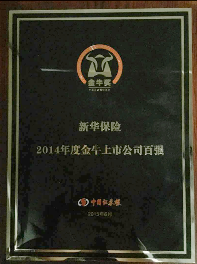 ?2015年6月,中國(guó)證券報(bào)第17屆(2014年度)上市公司金牛獎(jiǎng)隆重揭曉,新華保險(xiǎn)榮獲“金牛上市公司百?gòu)?qiáng)”獎(jiǎng)項(xiàng),這代表了資本市場(chǎng)以及社會(huì)各界對(duì)新華保險(xiǎn)在公司治理、信息披露、投資者關(guān)系等方面工作的高度認(rèn)可。