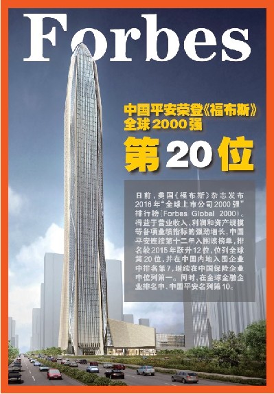 中國平安保險(xiǎn)(集團(tuán))股份有限公司連續(xù)第十二年入圍全球上市公司2000強(qiáng),排名較2015年躍升12位,位列全球第20位。