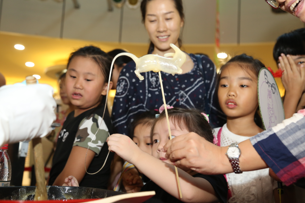現(xiàn)場,糖人制作師傅安靜地坐在展臺前,任人群在身邊走走停停,埋頭專注捏著各式形狀。只見他用竹篾緩緩攪拌麥芽糖,挖出一團放在手里揉捏拉扯,做出一個小管子,抿嘴往里吹氣,麥芽糖慢慢膨脹并逐漸變成透明,再迅速捏出頭和腳,一只糖老鼠便活靈活現(xiàn)地被“吹”了出來?!疤衿媪耍溠刻窃谑迨迨种凶兂闪恕睢?,沒想到傳統(tǒng)手工藝如此出神入化?!?0歲的玥玥瞧得津津有味,她說,比起逛商場和游樂場,這樣的體驗活動不僅能感受到中華傳統(tǒng)文化,還可以學(xué)到很多課本以外的知識。