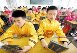 據(jù)悉,寶龍學(xué)校是寶安區(qū)第一所民辦學(xué)校,在校學(xué)生絕大多數(shù)為勞務(wù)工子女。孩子們的父母常常因忙于工作,而忽略了對(duì)他們的傳統(tǒng)道德教育?!皠倢W(xué)文化知識(shí)時(shí)不懂得基本禮儀是多數(shù)孩子的通病,很多孩子初入社會(huì)很難適應(yīng)?!痹撔6麻L(zhǎng)陳寶元表示,學(xué)校從上學(xué)期開始就從校外引進(jìn)國(guó)學(xué)老師,每天教授孩子們誦讀國(guó)學(xué)經(jīng)典。圖為寶龍學(xué)校的師生在課前齊誦國(guó)學(xué)經(jīng)典。