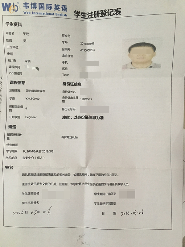 網(wǎng)友在深圳韋博英語上6節(jié)課花費34800元 退款難