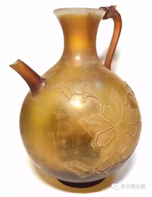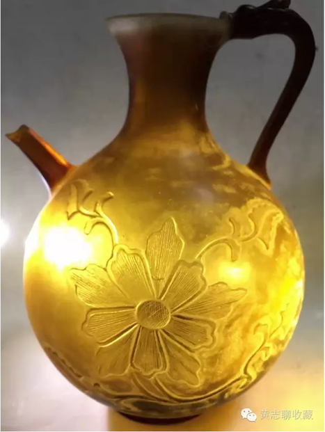 琉璃在唐代極為名貴。這從史書記載可窺一二。房玄齡的《晉書》中有關(guān)于琉璃器的記載“(王濟)性豪侈,麗服玉食……帝嘗幸其宅,供饌甚豐,悉貯琉璃器中?!蓖鯘谡写实蹠r用了成套的琉璃碗盤,以逞其豪富,可見當(dāng)時琉璃器之貴重或要超過金、銀等器。又如宋代司馬光主編的《資治通鑒》中記載了這樣一段歷史事實:嶺南節(jié)度使路嗣恭在平息叛亂中趁機劫掠商民,得到了大批財物。他把其中一個直徑九寸的琉璃盤獻給了唐代宗。唐代宗非常高興,“以為至寶”。法門寺地宮出土的唐代琉璃器大多為皇家捐贈的禮佛之物也可佐證其珍貴。 這件執(zhí)壺為琉璃材質(zhì),高20cm、腹徑14.5cm,色澤黃褐,半透明,晶瑩潤澤,光澤柔和。小口,束頸,腹部圓鼓,餅足;前有直流,后為龍柄。整體形制穩(wěn)重大方,圓潤飽滿,具有典型的唐代特征。壺身兩面刻有菊紋,線條流暢自然,勁健有力。整體透入出唐人的灑脫自信。這類唐代的琉璃作品存世極少,目前為數(shù)不多的一些作品大多出自窖藏、地宮及貴族墓葬,屬于珍稀文物。此件執(zhí)壺保存完整,尤為難得。 欣賞更多藏品,歡迎瀏覽【黃志博物館】網(wǎng)站:www.huangzhimuseum.com?