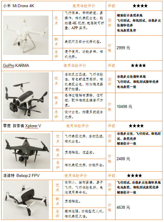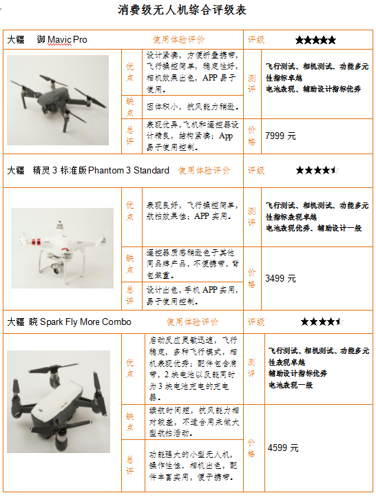 御Mavic Pro”和“精靈3標(biāo)準(zhǔn)版Phantom 3 Standard”,充電時(shí)間較短,續(xù)航時(shí)間較長,表現(xiàn)較好,獲評(píng)3.5分。