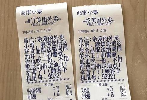 愛(ài)心外賣訂單顯示,該訂單沒(méi)有收件人及地址。但下單人何女士留言備注稱,“親愛(ài)的外賣小哥,麻煩您把這些食品配送給周圍的環(huán)衛(wèi)工和警察,您也吃一份,不用配送到指定地點(diǎn)!辛苦了!”