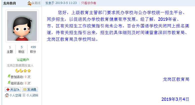 3月3日,有網(wǎng)友“清熱解毒”在深圳論壇以《不到24小時(shí),百合外國(guó)語(yǔ)學(xué)校網(wǎng)上報(bào)名,為何突然關(guān)閉...》為題發(fā)帖反映,“3月1日(周五)深圳眾多小學(xué)6年級(jí)家長(zhǎng)都收到了通知,百合外國(guó)語(yǔ)學(xué)校的信息填報(bào)時(shí)間為3月2日到3月5日。““平靜的周末被百外半夜的一則公告打亂了,家長(zhǎng)們更是被突如其來(lái)的新生登記急蒙了”。