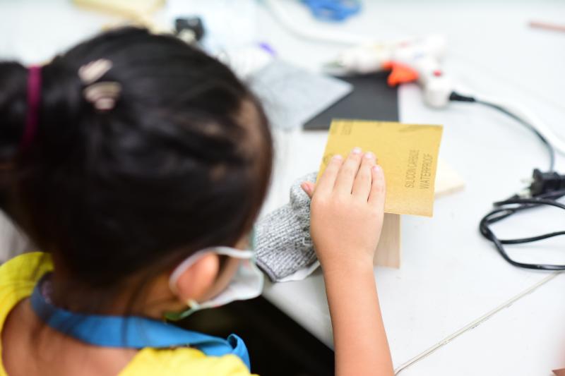 對(duì)于“小小木匠”來(lái)說(shuō),安安靜靜的坐下來(lái),發(fā)揮想象力,傾心打造屬于自己的木質(zhì)音樂(lè)盒,無(wú)疑是最開心的時(shí)刻。聽完老師的講解后,小朋友們迅速進(jìn)入角色,他們拿著原料木材,一個(gè)個(gè)化身“小魯班”,用尺子“計(jì)較長(zhǎng)短”,為它們“改頭換面”起來(lái)。活動(dòng)現(xiàn)場(chǎng),一位小朋友正拿著砂紙,小心翼翼的打磨木料,再問(wèn)及他打磨的工序時(shí),小朋友頗具匠心的告誡記者:“先要用這種粗一點(diǎn)的砂紙打磨,再用這個(gè)細(xì)的,這樣打磨出來(lái)的音樂(lè)盒表面就特別光滑啦……”