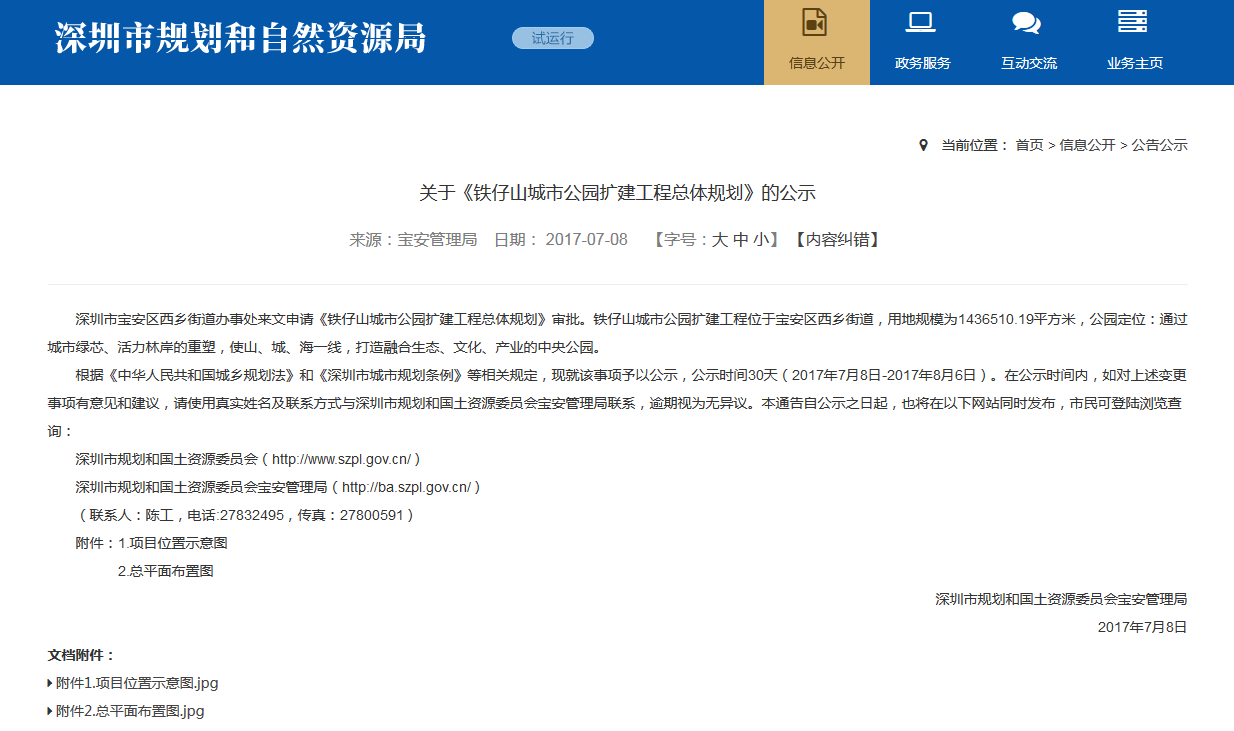 早在2017年,當(dāng)時(shí)的市規(guī)土委曾經(jīng)在官方網(wǎng)站發(fā)布了《關(guān)于<鐵仔山城市公園擴(kuò)建工程總體規(guī)劃>的公示》:深圳市寶安區(qū)西鄉(xiāng)街道辦事處來文申請(qǐng)《鐵仔山城市公園擴(kuò)建工程總體規(guī)劃》審批。鐵仔山城市公園擴(kuò)建工程位于寶安區(qū)西鄉(xiāng)街道,用地規(guī)模為1436510.19平方米,公園定位:通過城市綠芯、活力林岸的重塑,使山、城、海一線,打造融合生態(tài)、文化、產(chǎn)業(yè)的中央公園。