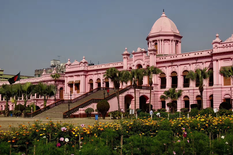 距孟加拉恒河渡口不遠(yuǎn)的地方有一座粉紅色宮殿式的豪華建筑。那是1872年一位名叫阿赫桑曼濟(jì)勒的地主在法國人留下的倉房基礎(chǔ)上改建的私邸,后來曾在一次龍卷風(fēng)襲擊時受創(chuàng)。李仁奇 攝