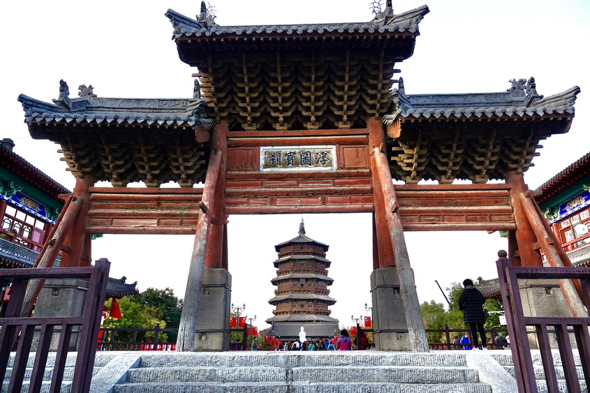 釋迦塔高67.31米,底層直徑30.27米,呈平面八角形。全塔用紅松木料3000立方米,重2600多噸,純木結構、無釘無鉚。塔內供奉著兩顆釋迦牟尼佛牙舍利。李仁奇攝