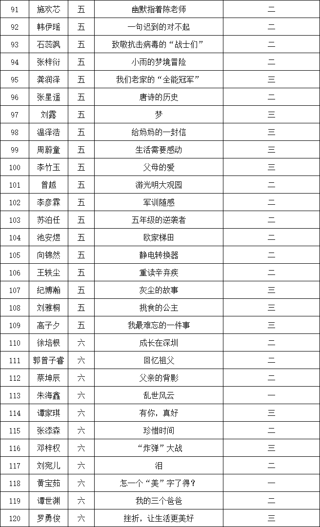 自2021年1月,活動(dòng)征稿啟動(dòng)以來(lái),獲得了深圳市廣大中小學(xué)生、教師、文學(xué)愛(ài)好者的熱烈響應(yīng)積極參與,吸引了深圳百余所學(xué)校的上萬(wàn)人關(guān)注報(bào)名?,F(xiàn)公布南山實(shí)驗(yàn)教育集團(tuán)前海港灣學(xué)校校園專場(chǎng)晉級(jí)復(fù)賽名單如下: