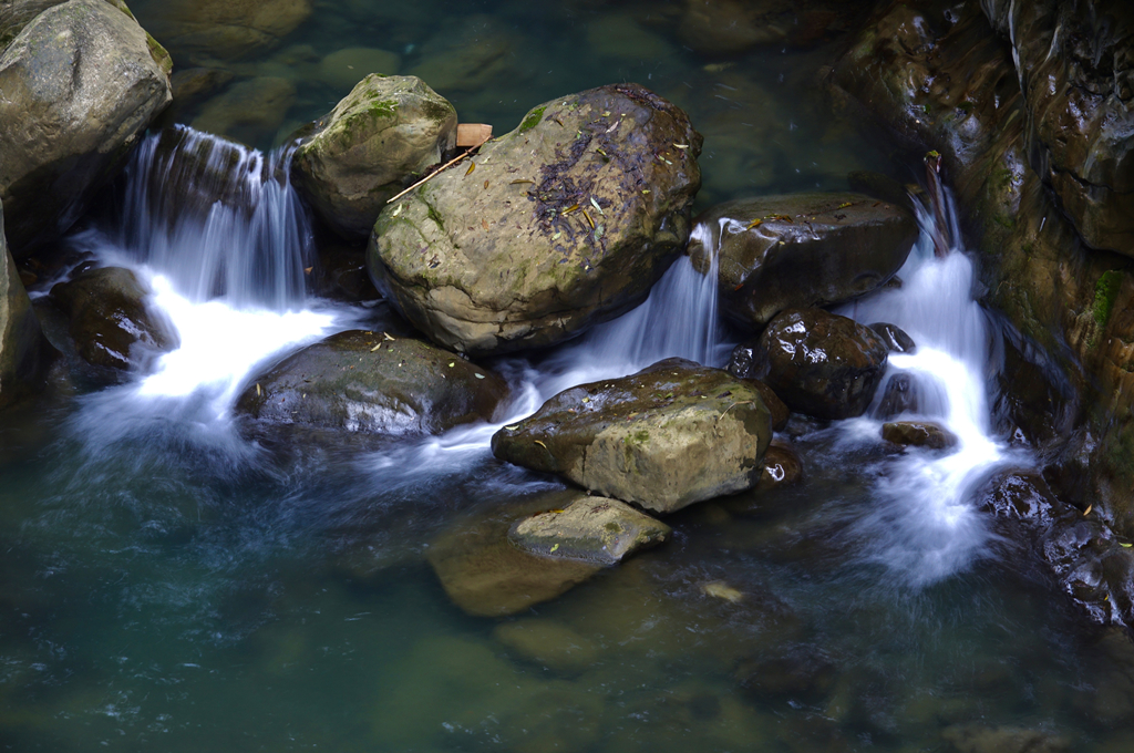 若從廊橋觀瀑底,鈣華體又酷似一只昂首“金龜”,在享受清瀑沐浴,即金龜戲瀑。特別是在太陽照射下、瀑水飛濺,便可見地縫彩虹、鐵染谷底巖石呈橙紅色。李仁奇 攝