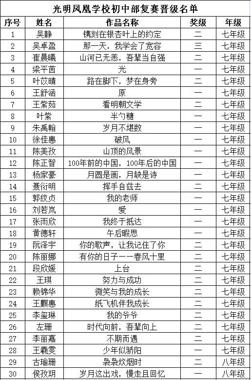 自2021年1月,活動征稿啟動以來,獲得了深圳市廣大中小學(xué)生、教師、文學(xué)愛好者的熱烈響應(yīng)積極參與,吸引了深圳百余所學(xué)校的上萬人關(guān)注報名。現(xiàn)公布光明區(qū)鳳凰學(xué)校晉級復(fù)賽名單如下: