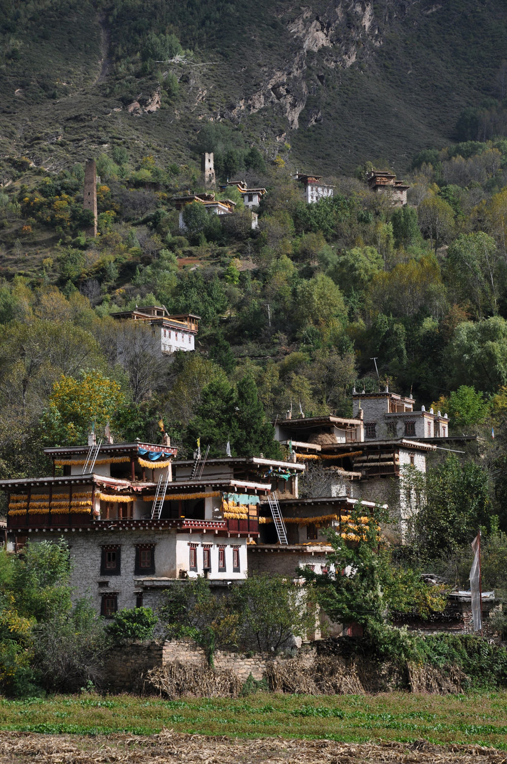 嘉絨藏民多居住在河谷或半山向陽的寨子里。自古以來,他們建就地取材建房,用黃泥作粘合劑,以石塊砌墻,以巨木為梁,橫搭雜木,蓋土于上,堅固不漏。李仁奇 攝