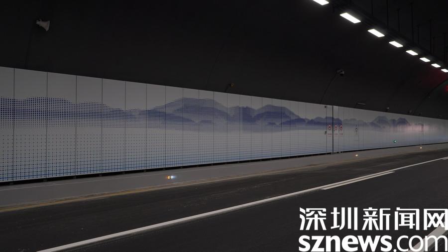 到達隧道的中段部分,映入記者眼簾的是一道道彩色的燈帶,這些燈帶可以根據(jù)環(huán)境光變換成七種不同的顏色,可謂科技感十足。在即將駛出隧道口200米處,我們能看采用彩色絲印搪瓷鋼板呈現(xiàn)的坪山地貌風(fēng)光、鹽田山海風(fēng)光,這意味著,我們穿過了馬巒山的山體,一下子從坪山來到了鹽田區(qū)范圍內(nèi)的惠深沿海高速,這趟坪山到鹽田的隧道之旅僅僅不到10分鐘就要結(jié)束了。
