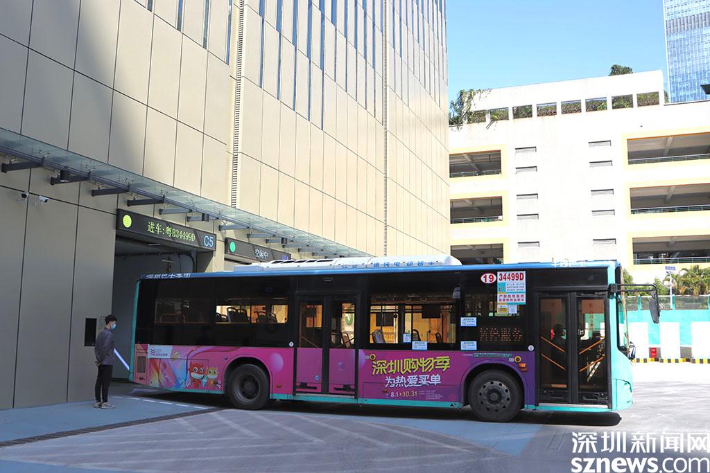 巴士正在倒入智慧公交車庫。