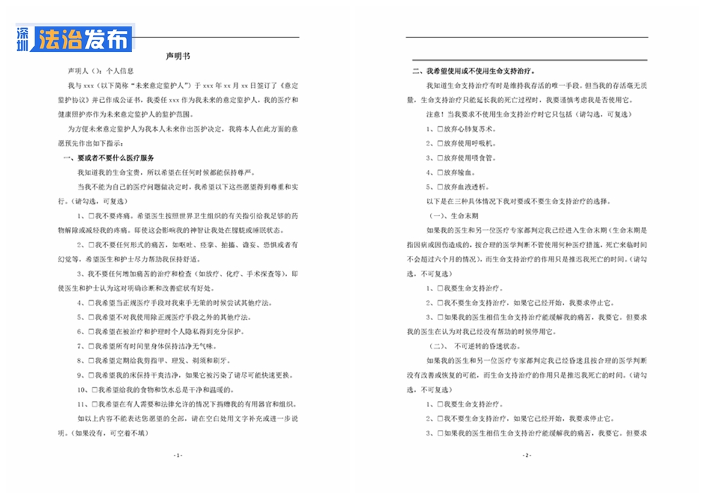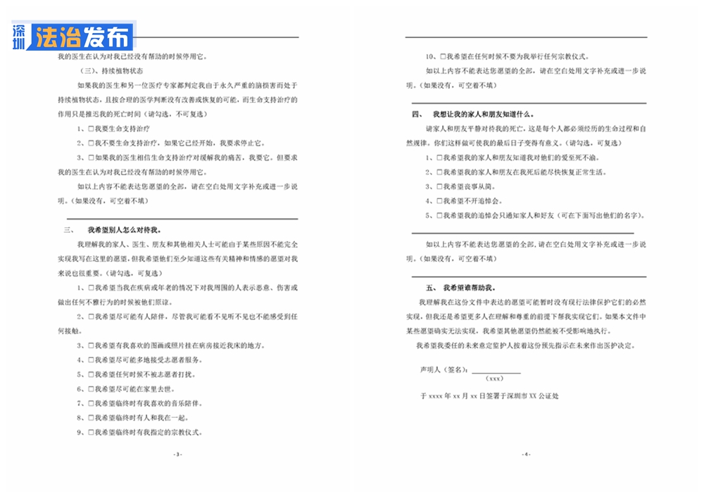 除了生前預(yù)囑的3種情況外,杜芹律師公證的這份聲明書,包含5個愿望清單①我要或不要什么醫(yī)療服務(wù)②我希望使用或者不使用生命支持治療③我希望別人怎么對待我④我想讓我的家人和朋友知道什么⑤我希望誰幫助我。