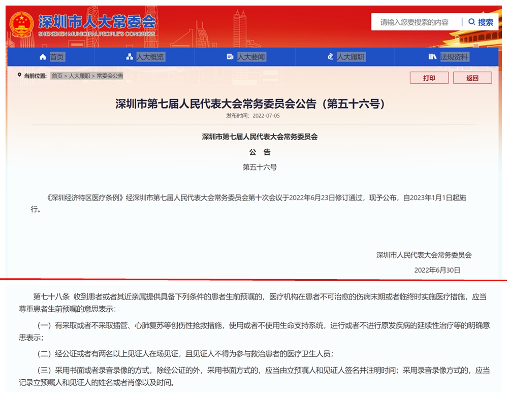 讀特客戶端·深圳新聞網(wǎng)2022年7月8日(記者 張玲 翁任瑩)7月5日,北京市盈科(深圳)律師事務(wù)所律師杜芹到深圳公證處,為自己做了一份生前預(yù)囑。這份生前預(yù)囑,有可能成為深圳首份公證的生前預(yù)囑。6月23日,深圳市人大常委會表決通過《深圳經(jīng)濟特區(qū)醫(yī)療條例》(以下簡稱《條例》),該《條例》將于2023年1月1日起施行。深圳通過立法率先建立的“生前預(yù)囑制度”可謂一石激起千層浪,引發(fā)全國網(wǎng)友和各方持續(xù)關(guān)注。