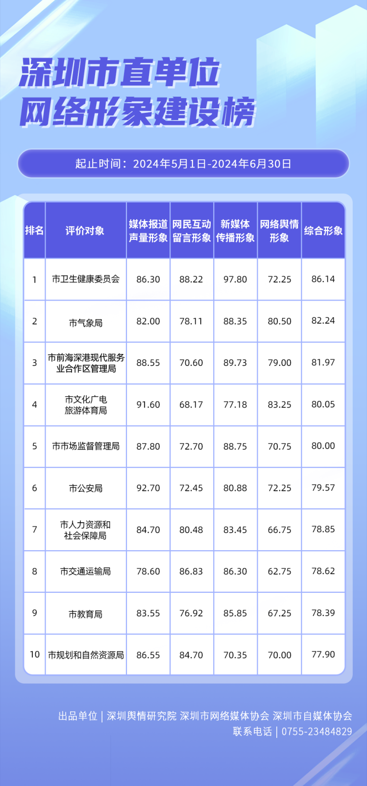 為全面評(píng)估深圳各區(qū)各單位網(wǎng)絡(luò)形象建設(shè)情況,助力各區(qū)各單位持續(xù)響應(yīng)居民對(duì)美好生活的期許,賦能城市高質(zhì)量發(fā)展,深圳輿情研究院、深圳市網(wǎng)絡(luò)媒體協(xié)會(huì)、深圳市自媒體協(xié)會(huì)聯(lián)合推出“深圳各區(qū)各單位網(wǎng)絡(luò)形象建設(shè)榜”,從網(wǎng)絡(luò)聚合聲量、留言互動(dòng)成效、社會(huì)生活評(píng)價(jià)、輿情管理能力及新媒體傳播水平等方面,多維度分析深圳各區(qū)(含大鵬新區(qū)、深汕特別合作區(qū))、各市直單位(市直屬單位、直屬部門)的網(wǎng)絡(luò)形象建設(shè)成果,凸顯各區(qū)各單位的“共性”與“個(gè)性”。