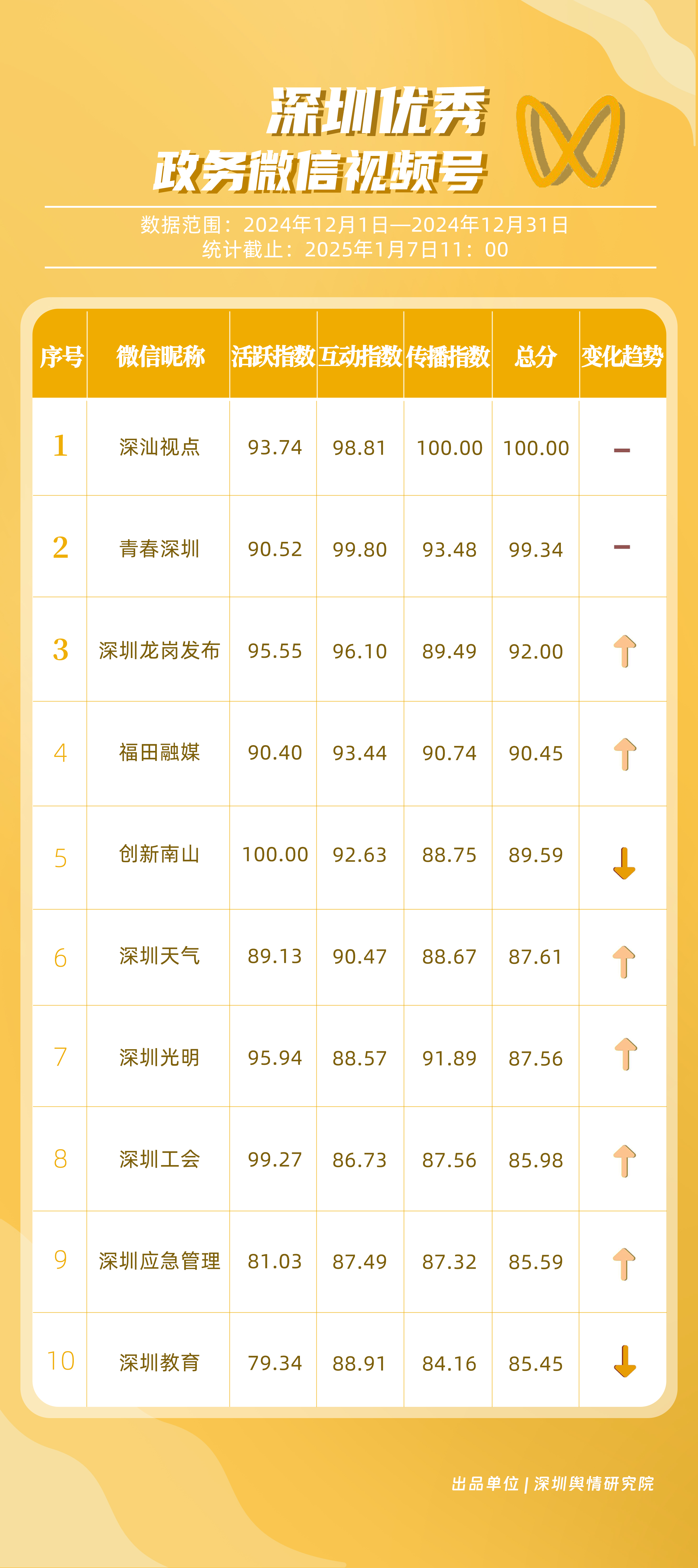 12月,獲“深圳優(yōu)秀政務(wù)微信視頻號”稱號的分別是“深汕視點(diǎn)”“青春深圳”“深圳龍崗發(fā)布”“福田融媒”“創(chuàng)新南山”“深圳天氣”“深圳光明”“深圳工會(huì)”“深圳應(yīng)急管理”“深圳教育”。其中,“深汕視點(diǎn)”“青春深圳”在互動(dòng)方面表現(xiàn)突出,占據(jù)榜單第一、第二位置?!吧钲邶垗彴l(fā)布”活躍、互動(dòng)指數(shù)位于各政務(wù)視頻號前列,排名有所提升?!案L锶诿健比笾笜?biāo)得分均在90分以上,位于榜單第四名,充分展現(xiàn)各政務(wù)微信視頻號在信息更新、用戶互動(dòng)以及傳播范圍等方面的卓越能力和持續(xù)進(jìn)步。