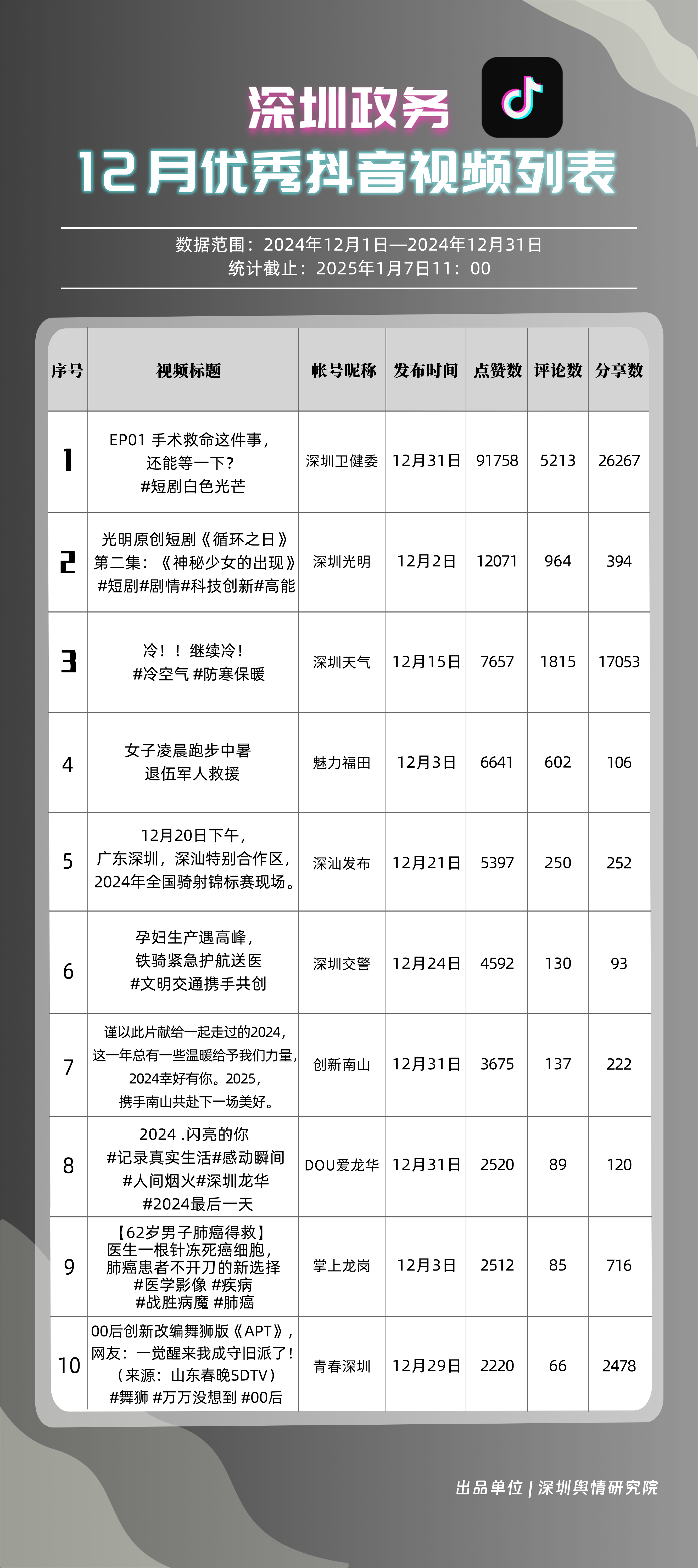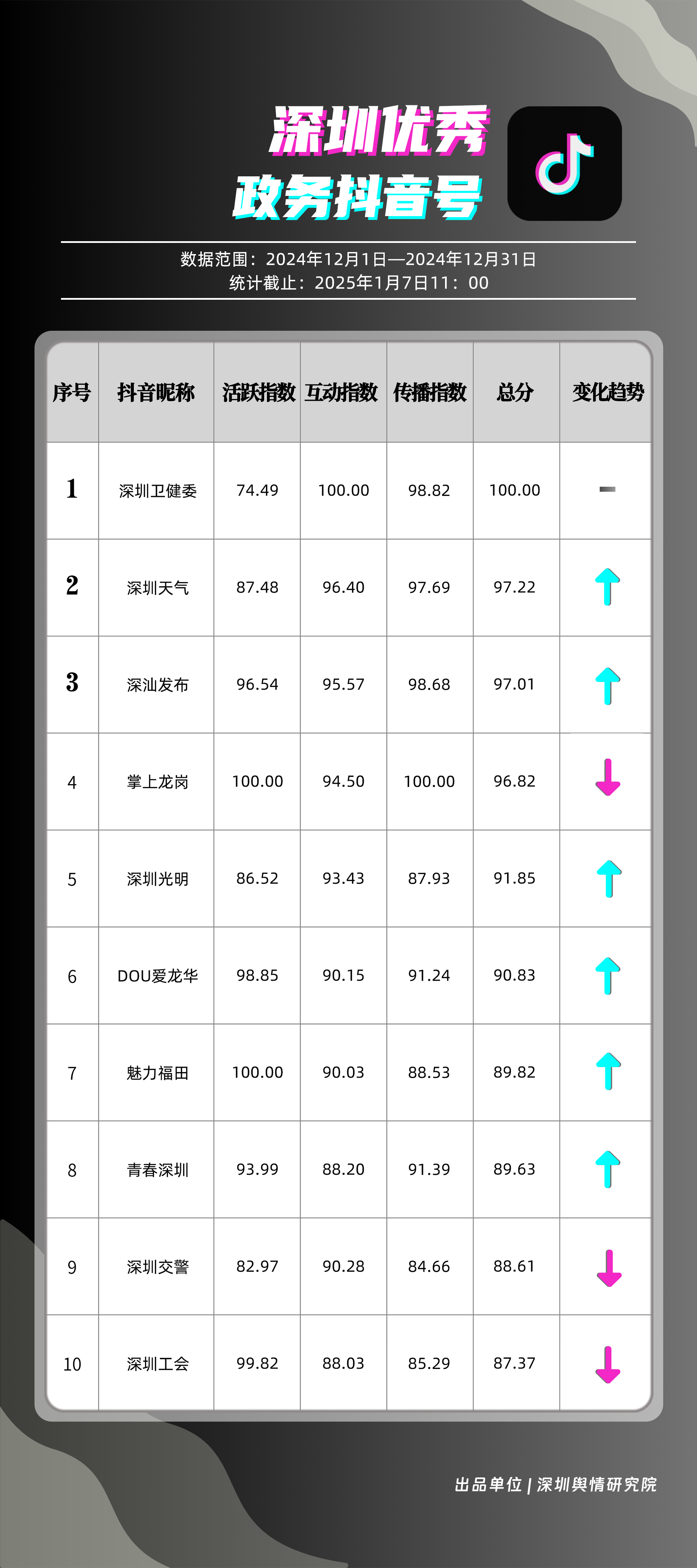 12月,“深圳衛(wèi)健委”“深圳天氣”“深汕發(fā)布”“掌上龍崗”“深圳光明”“DOU愛龍華”“魅力福田”“青春深圳”“深圳交警”“深圳工會(huì)”共10個(gè)政務(wù)抖音號獲得“深圳優(yōu)秀政務(wù)抖音號”稱號?!吧钲谛l(wèi)健委”在互動(dòng)、傳播方面成績優(yōu)異,助推其位于榜單首位?!吧钲谔鞖狻薄吧钌前l(fā)布”“掌上龍崗”則各有所長,綜合排名位于榜單前列,內(nèi)容產(chǎn)出豐富、用戶互動(dòng)高頻,信息傳播廣泛,共同展現(xiàn)了政務(wù)抖音號在服務(wù)公眾、提升信息傳播效能方面的顯著效能。
