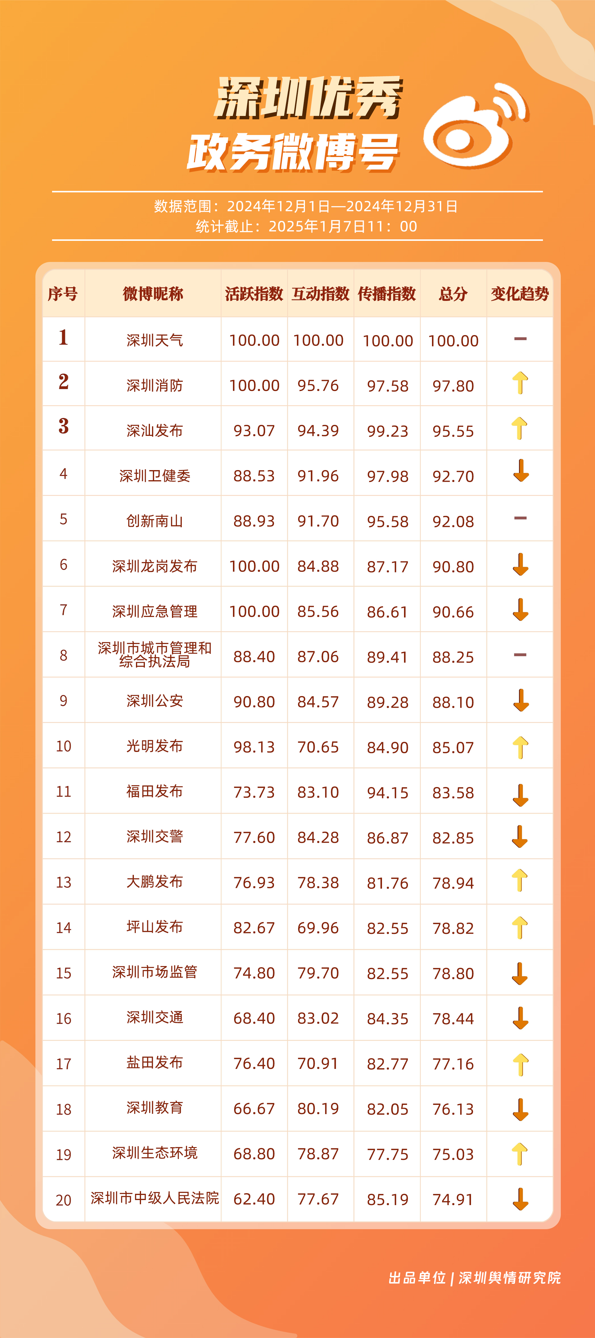 12月,“深圳天氣”“深圳消防”“深汕發(fā)布”“深圳衛(wèi)健委”“創(chuàng)新南山”“深圳龍崗發(fā)布”“深圳應(yīng)急管理”“深圳市城市管理和綜合執(zhí)法局”“深圳公安”“光明發(fā)布”等20個(gè)賬號入選“優(yōu)秀政務(wù)微博號”。“深圳天氣”獲得滿分,“深圳消防”“深汕發(fā)布”賬號總分均超95分,位于榜單前三名。同時(shí),“深圳衛(wèi)健委”“創(chuàng)新南山”“深圳龍崗發(fā)布”及“深圳應(yīng)急管理”等賬號憑借對熱點(diǎn)的敏銳捕捉與信息的及時(shí)發(fā)布,總分在90分以上,體現(xiàn)出各自在提升公眾信息獲取質(zhì)量方面的不懈努力,彰顯了政務(wù)微博賬號在政民連接、信息共享等方面的巨大價(jià)值。