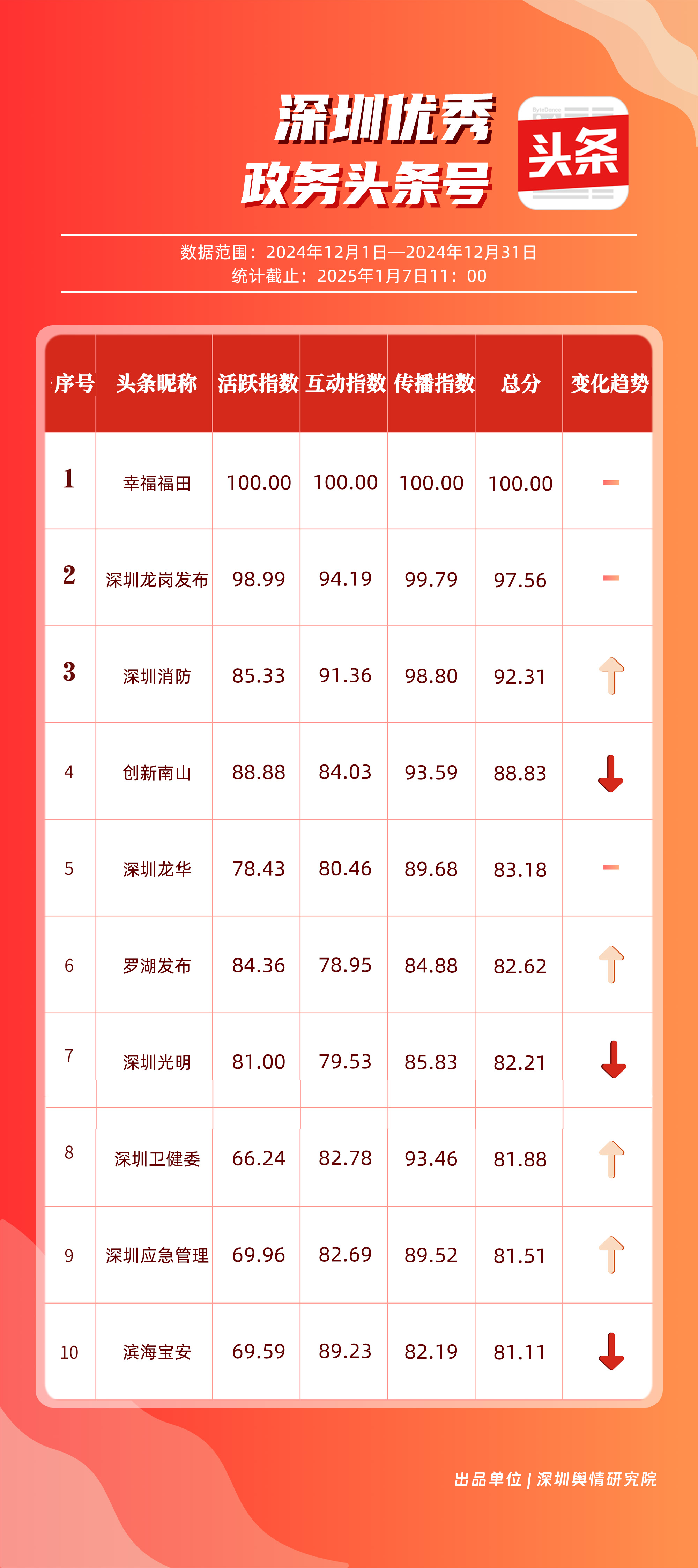 12月,“幸福福田”“深圳龍崗發(fā)布”“深圳消防”“創(chuàng)新南山”“深圳龍華”“羅湖發(fā)布”“深圳光明”“深圳衛(wèi)健委”“深圳應(yīng)急管理”“濱海寶安”共10個(gè)政務(wù)頭條號入選“優(yōu)秀政務(wù)頭條號”榜單。對比其他賬號,“幸福福田”在各方面均取得較好成績,居于榜單第一位置?!吧钲邶垗彴l(fā)布”以97.56分位于榜單第二名,其傳播指數(shù)得分為99.79分,反映出賬號在信息傳播范圍方面存在明顯優(yōu)勢。此外,賬號“深圳消防”“創(chuàng)新南山”“深圳龍華”也為市民提供便捷、高效的政務(wù)信息,位于榜單前五名。