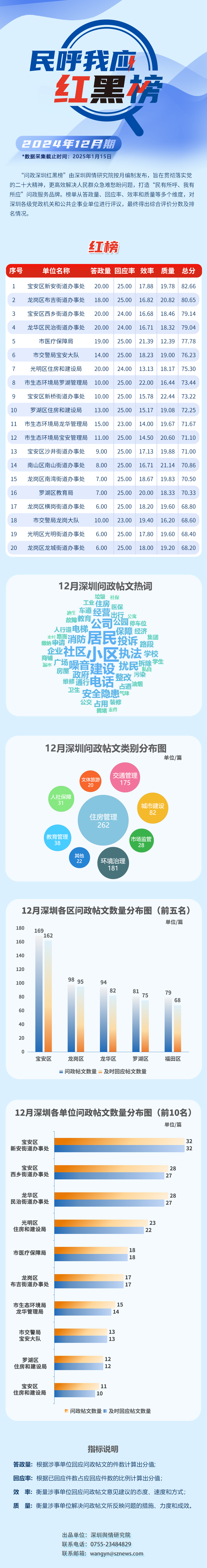 本期榜單采集的帖文主要來自深圳市及各區(qū)政府官網(wǎng)、深圳論壇、人民網(wǎng)領(lǐng)導(dǎo)留言板、深圳新聞網(wǎng)“民呼我應(yīng)”等平臺(tái),所采集帖文發(fā)布時(shí)間為2024年12月1日至12月31日,采集截止時(shí)間為2025年1月15日。