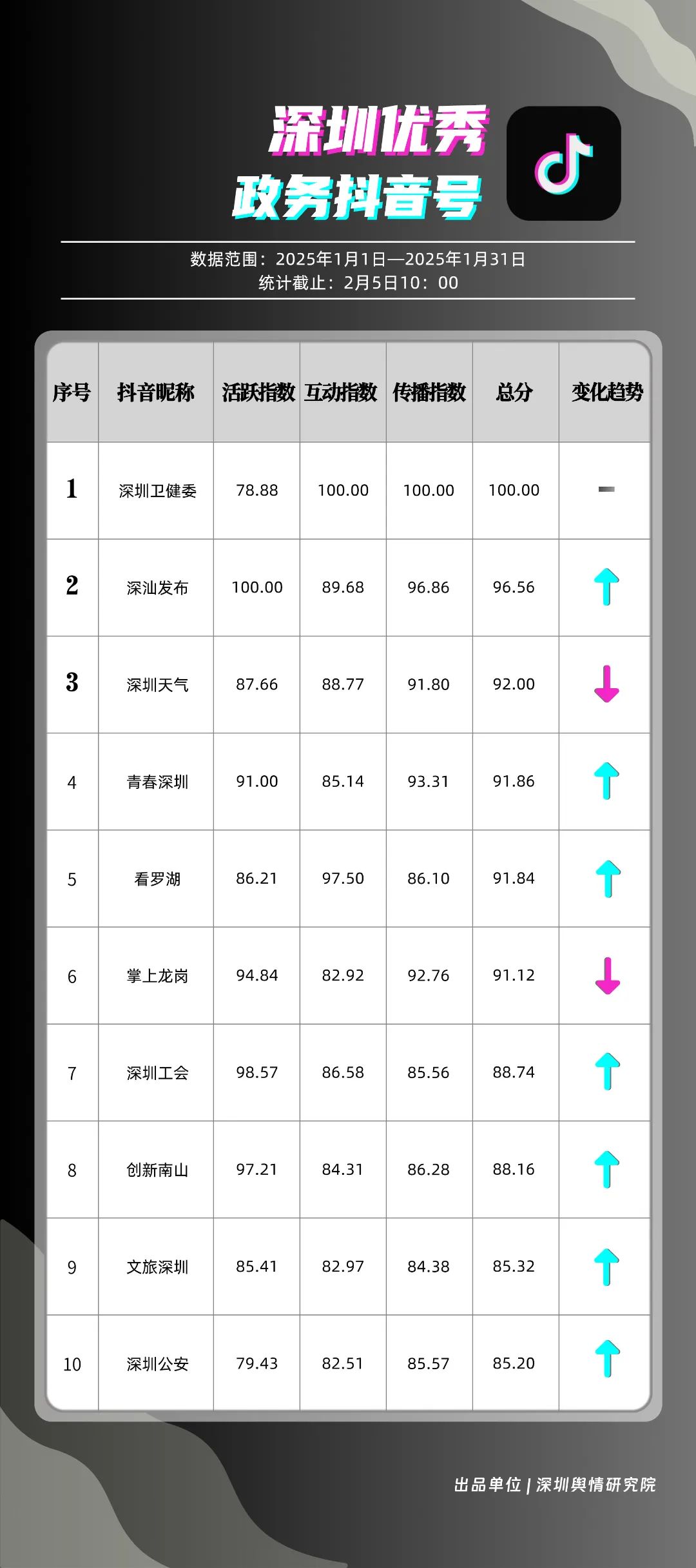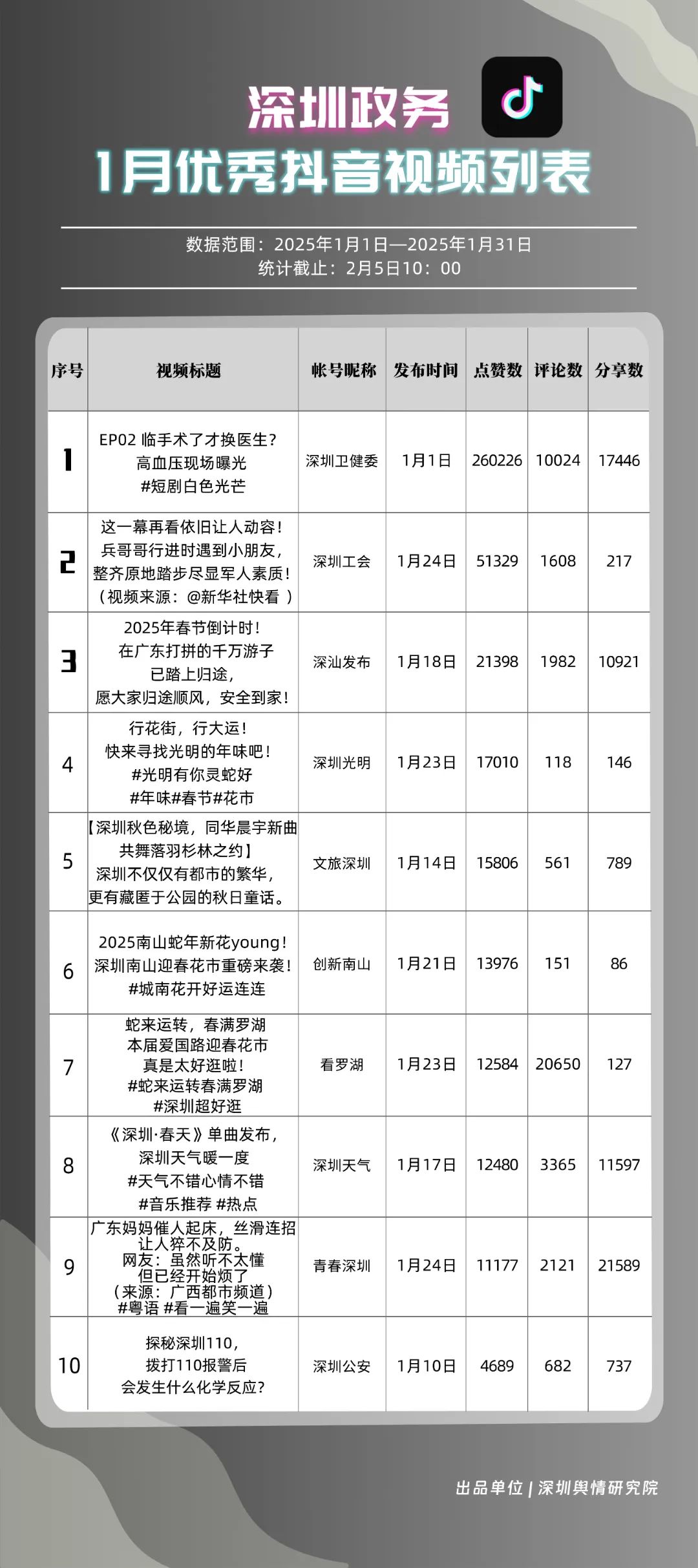 1月,“深圳衛(wèi)健委”“深汕發(fā)布”“深圳天氣”“青春深圳”“看羅湖”“掌上龍崗”“深圳工會”“創(chuàng)新南山”“文旅深圳”“深圳公安”共10個政務(wù)抖音號獲得“深圳優(yōu)秀政務(wù)抖音號”稱號?!吧钲谛l(wèi)健委”“深汕發(fā)布”“深圳天氣”成績優(yōu)異,綜合實(shí)力較強(qiáng),位于榜單前列?!扒啻荷钲凇薄翱戳_湖”等賬號排名有所提升,彰顯了這些賬號在拓寬受眾基礎(chǔ)、增強(qiáng)用戶黏性等方面所取得的積極成效。
