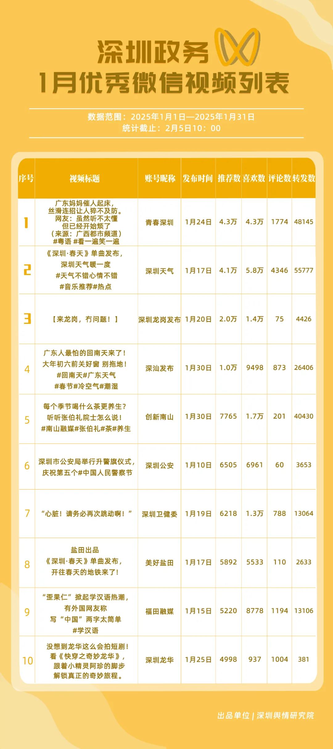 1月,獲“深圳優(yōu)秀政務(wù)微信視頻號”稱號的分別是“深汕發(fā)布”“深圳天氣”“青春深圳”“創(chuàng)新南山”“深圳衛(wèi)健委”“深圳龍崗發(fā)布”“福田融媒”“深圳應(yīng)急管理”“深圳光明”“深圳公安”。其中,“深汕發(fā)布”互動、傳播數(shù)據(jù)較高,占據(jù)榜單首位。“深圳天氣”“青春深圳”具有較高活躍度,互動數(shù)據(jù)良好,總分超95分,位于榜單第二、三名。“創(chuàng)新南山”“深圳衛(wèi)健委”“深圳應(yīng)急管理”“深圳公安”在排名上有所上升,彰顯了這些賬號在提升政務(wù)信息傳播效率等方面有所作為。