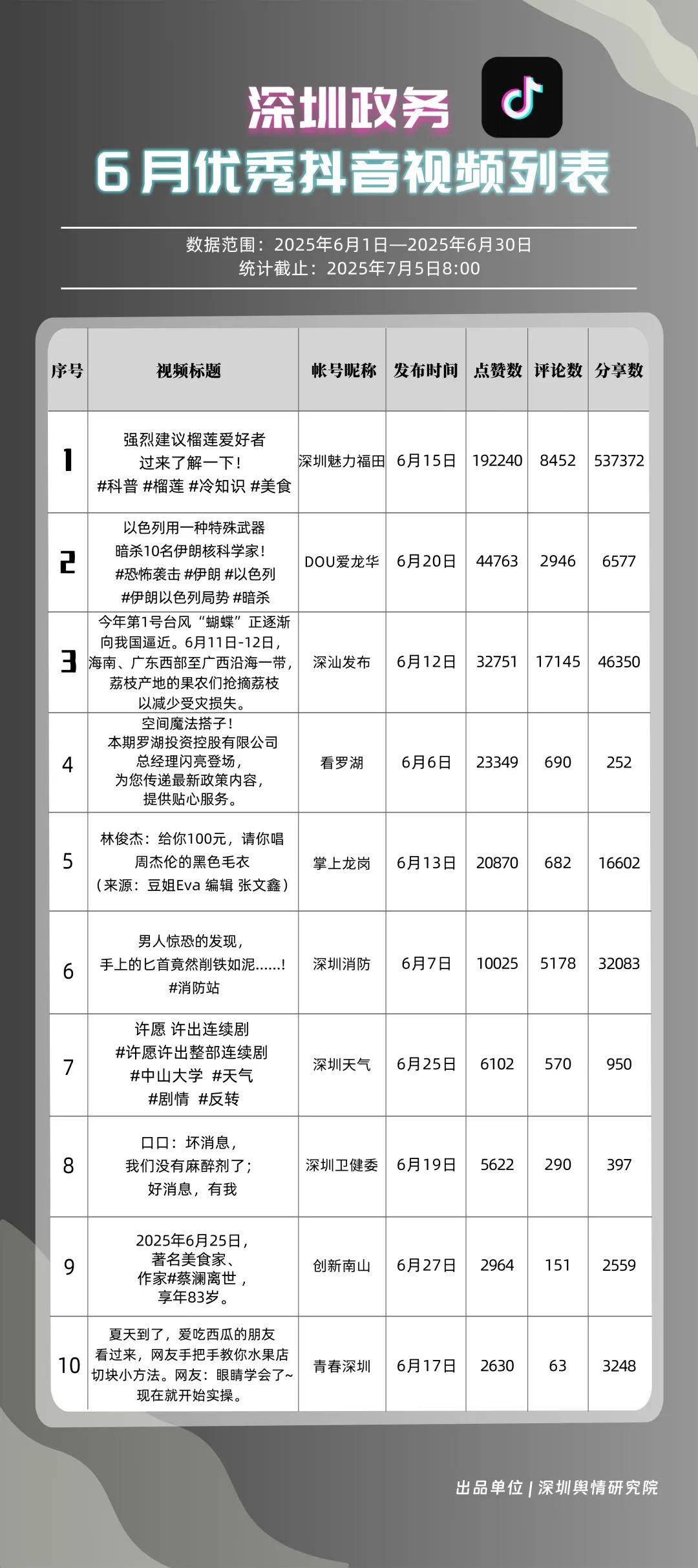 6月,“深圳魅力福田”“DOU愛龍華”“深汕發(fā)布”“掌上龍崗”“深圳天氣”“深圳消防”“創(chuàng)新南山”“青春深圳”“深圳交警”“看羅湖”共10個(gè)政務(wù)抖音號(hào)獲得“優(yōu)秀政務(wù)抖音號(hào)”稱號(hào)。6月,“深圳魅力福田”登頂,憑借其城市人文、社會(huì)熱點(diǎn)類主題短視頻,在傳播指數(shù)得分創(chuàng)新高;“DOU愛龍華”“深汕發(fā)布”“掌上龍崗”緊隨其后,通過各類熱點(diǎn)、創(chuàng)意內(nèi)容提升傳播效能。“深圳天氣”“深圳消防”也表現(xiàn)突出,短視頻內(nèi)容兼具“信息傳遞”與“情感共鳴”,用戶參與度持續(xù)提升,不斷為網(wǎng)民傳播有價(jià)值的政務(wù)信息資訊。