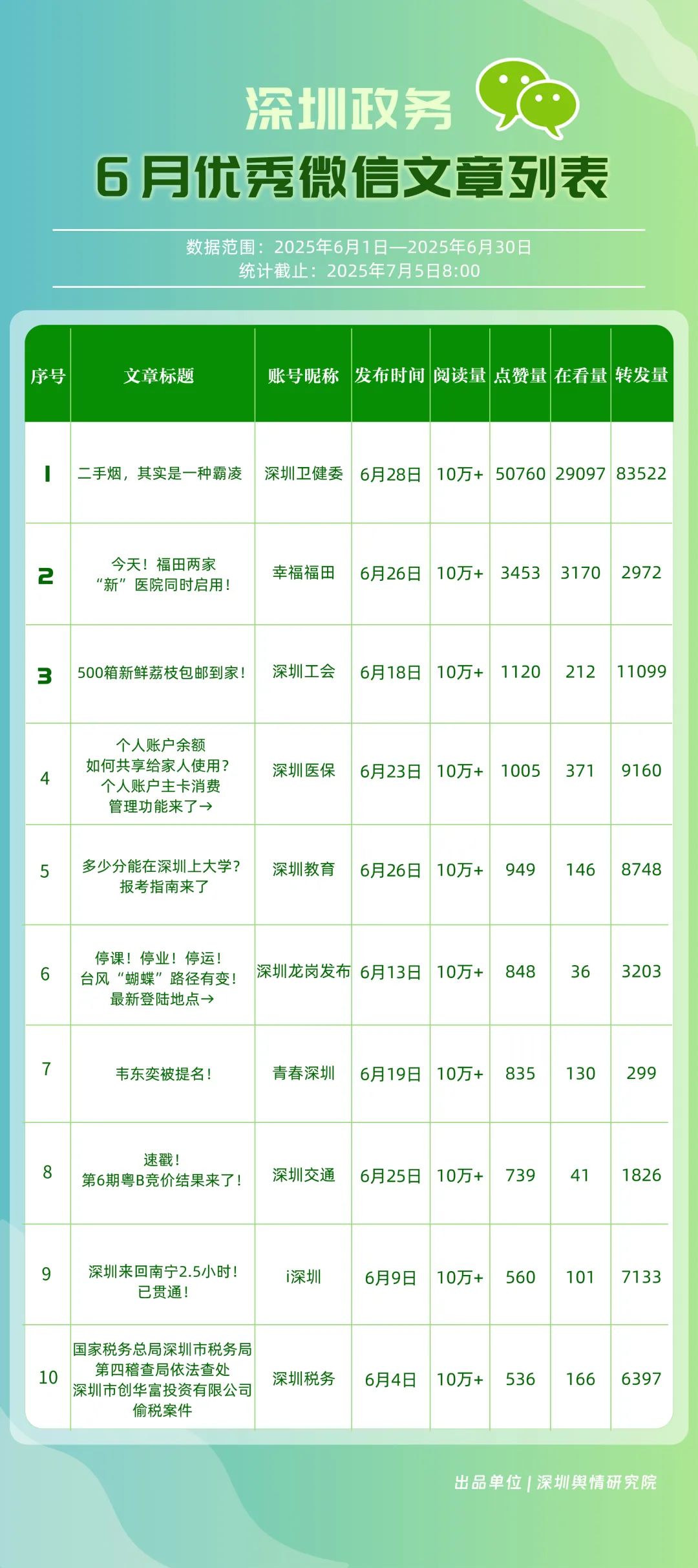 6月,“深圳天氣”“深圳衛(wèi)健委”“深圳消防”“深圳應(yīng)急管理”“創(chuàng)新南山”“深汕發(fā)布”“福田發(fā)布”“深圳公安”“深圳龍崗發(fā)布”“深圳交警”等20個(gè)賬號(hào)入選“優(yōu)秀政務(wù)微博號(hào)”。其中,“深圳天氣”以活躍、互動(dòng)指數(shù)雙滿分穩(wěn)居第一,氣象服務(wù)信息及時(shí)性與科普內(nèi)容趣味性獲市民高度認(rèn)可;“深圳衛(wèi)健委”“深圳消防”“深圳應(yīng)急管理”分別位列2至4位,通過熱點(diǎn)話題聯(lián)動(dòng)醫(yī)療、消防、應(yīng)急知識(shí)科普擴(kuò)大影響力,政務(wù)微博矩陣在突發(fā)事件響應(yīng)與民生服務(wù)中作用凸顯。