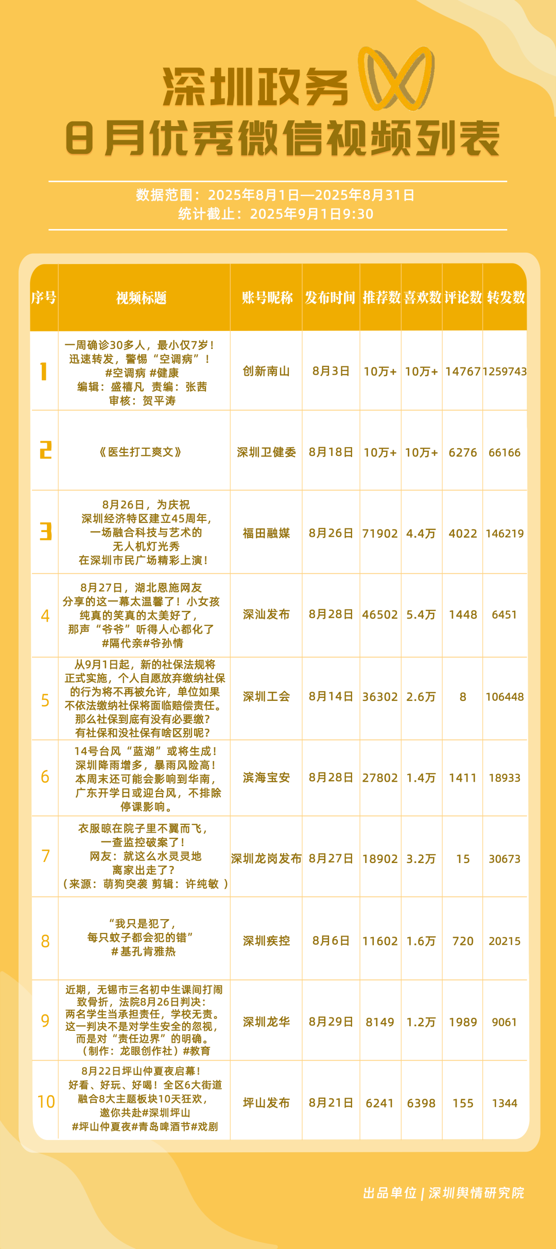 8月,“深圳衛(wèi)健委”“深汕發(fā)布”“深圳魅力福田”“深圳天氣”“掌上龍崗”“DOU愛龍華”“創(chuàng)新南山”“深圳普法”“文旅深圳”“美好鹽田”共10個(gè)政務(wù)抖音號(hào)獲得“優(yōu)秀政務(wù)抖音號(hào)”稱號(hào)?!吧钲谛l(wèi)健委”內(nèi)容吸引大量網(wǎng)民關(guān)注,4條視頻累計(jì)獲得超50萬(wàn)次點(diǎn)贊,排名從上期的第九名上升至第一名;“深汕發(fā)布”憑借較高的傳播指數(shù)評(píng)分,位列第二名,排名有所上升。“深圳魅力福田”“深圳天氣”等賬號(hào)緊隨其后,得分均在95分左右。上榜的優(yōu)秀政務(wù)抖音號(hào)深耕優(yōu)質(zhì)創(chuàng)作,精準(zhǔn)把握網(wǎng)民興趣點(diǎn),使作品收獲高點(diǎn)贊、高轉(zhuǎn)發(fā),推動(dòng)評(píng)論區(qū)形成良性互動(dòng)氛圍,以優(yōu)秀內(nèi)容提升政務(wù)傳播效能。
