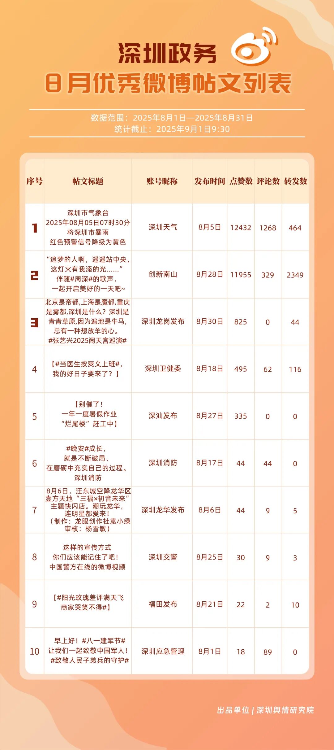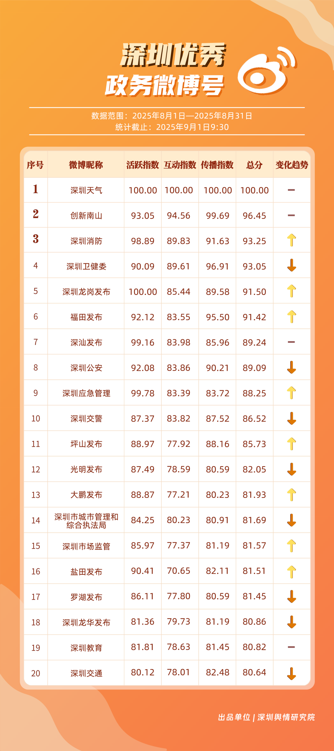8月,“深圳天氣”“創(chuàng)新南山”“深圳消防”“深圳衛(wèi)健委”“深圳龍崗發(fā)布”“福田發(fā)布”“深汕發(fā)布”“深圳公安”“深圳應(yīng)急管理”“深圳交警”等20個(gè)賬號(hào)入選“優(yōu)秀政務(wù)微博號(hào)”。其中,“深圳天氣”持續(xù)以優(yōu)質(zhì)內(nèi)容受到網(wǎng)民肯定,蟬聯(lián)榜首;“創(chuàng)新南山”傳播指數(shù)得分再提升,總分96.45,排名保持在第二位;“深圳消防”積極發(fā)布消防相關(guān)內(nèi)容,以93.25分位列第三。上榜優(yōu)秀政務(wù)微博賬號(hào)精準(zhǔn)把握網(wǎng)民興趣點(diǎn),內(nèi)容獨(dú)具風(fēng)采,收獲網(wǎng)民認(rèn)可,實(shí)現(xiàn)了較好的傳播效果。