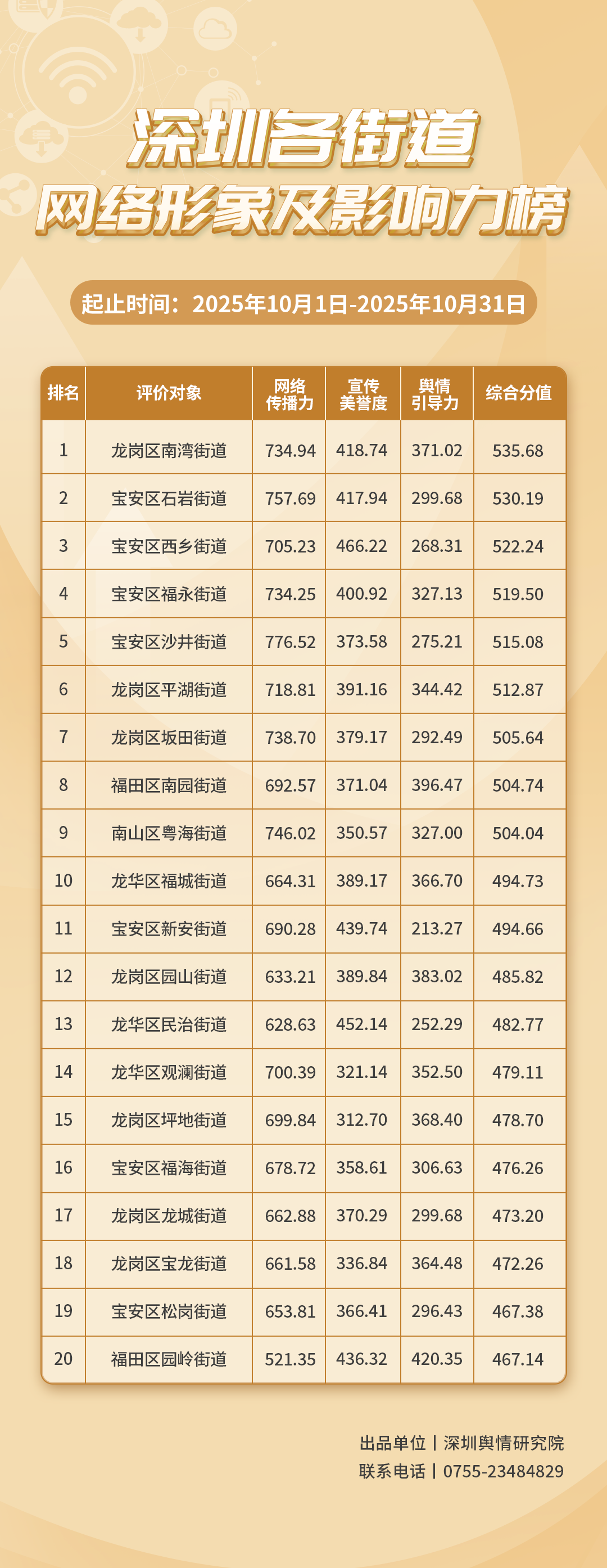 為深入了解深圳市各街道的網(wǎng)絡(luò)形象構(gòu)建狀況和社會影響,推動街道治理“提質(zhì)增效”,增強城市高質(zhì)量發(fā)展動能,深圳輿情研究院編制推出《深圳各街道網(wǎng)絡(luò)形象及影響力榜》。榜單具有獨立客觀的評價體系,通過數(shù)據(jù)采集和分析,評估各街道的網(wǎng)絡(luò)傳播力、宣傳美譽度及輿情引導力,并對全市11個區(qū)共78個街道的網(wǎng)絡(luò)形象及影響力進行綜合排名。