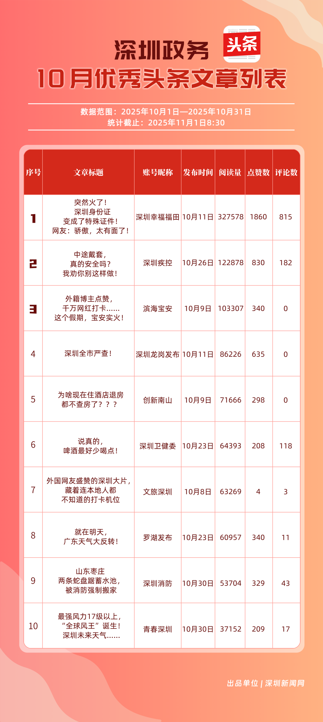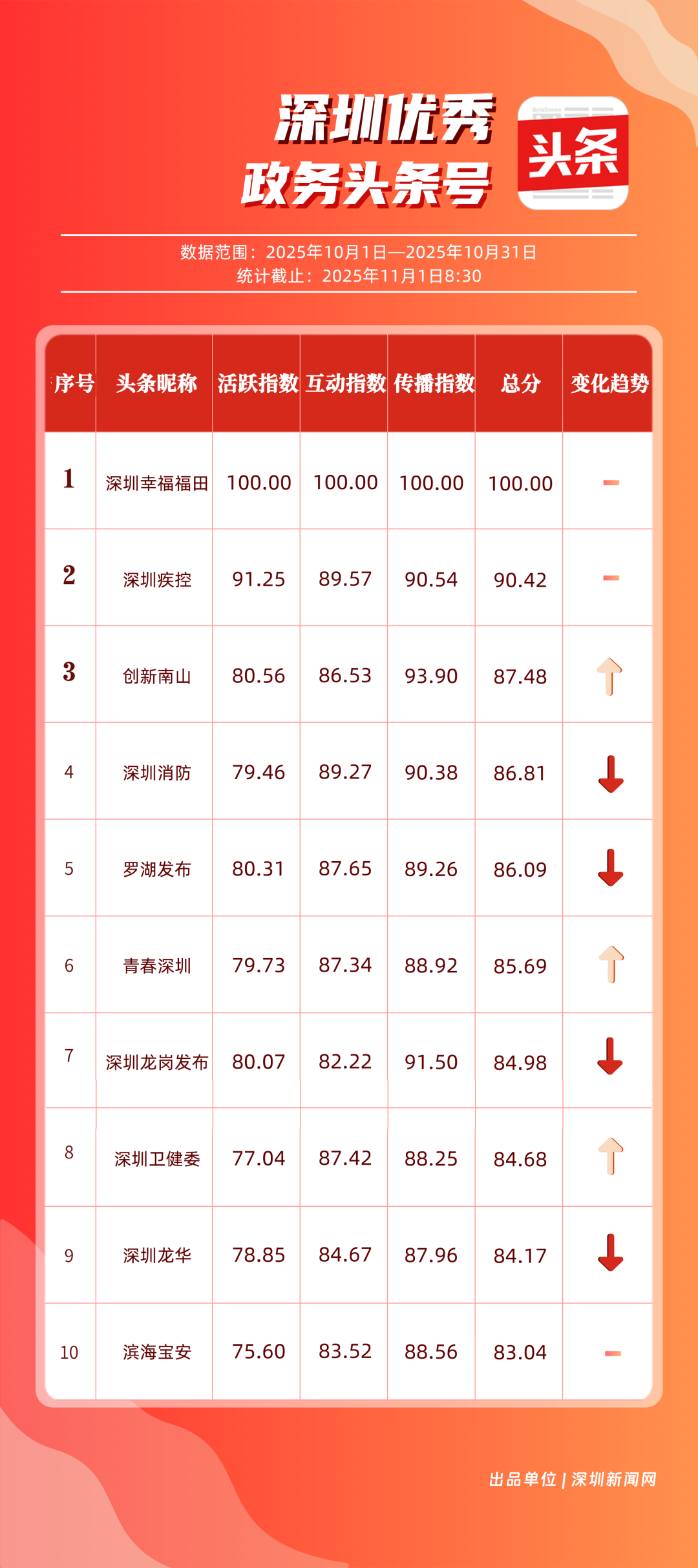 10月,“深圳幸福福田”“深圳疾控”“創(chuàng)新南山”“深圳消防”“羅湖發(fā)布”“青春深圳”“深圳龍崗發(fā)布”“深圳衛(wèi)健委”“深圳龍華”“濱海寶安”共10個政務頭條號入選“優(yōu)秀政務頭條號”榜單?!吧钲谛腋8L铩痹诨钴S、互動、傳播均收獲較好成果,蟬聯(lián)榜首;“深圳疾控”得分超90分,持續(xù)發(fā)布民生健康類內(nèi)容,為市民健康保駕護航;“創(chuàng)新南山”內(nèi)容創(chuàng)作緊扣民生與區(qū)域特色,位列榜單第三名?!吧钲谙馈薄傲_湖發(fā)布”等賬號也位列榜單前列,成為區(qū)域政務新媒體內(nèi)容創(chuàng)新、信息傳遞的標桿。