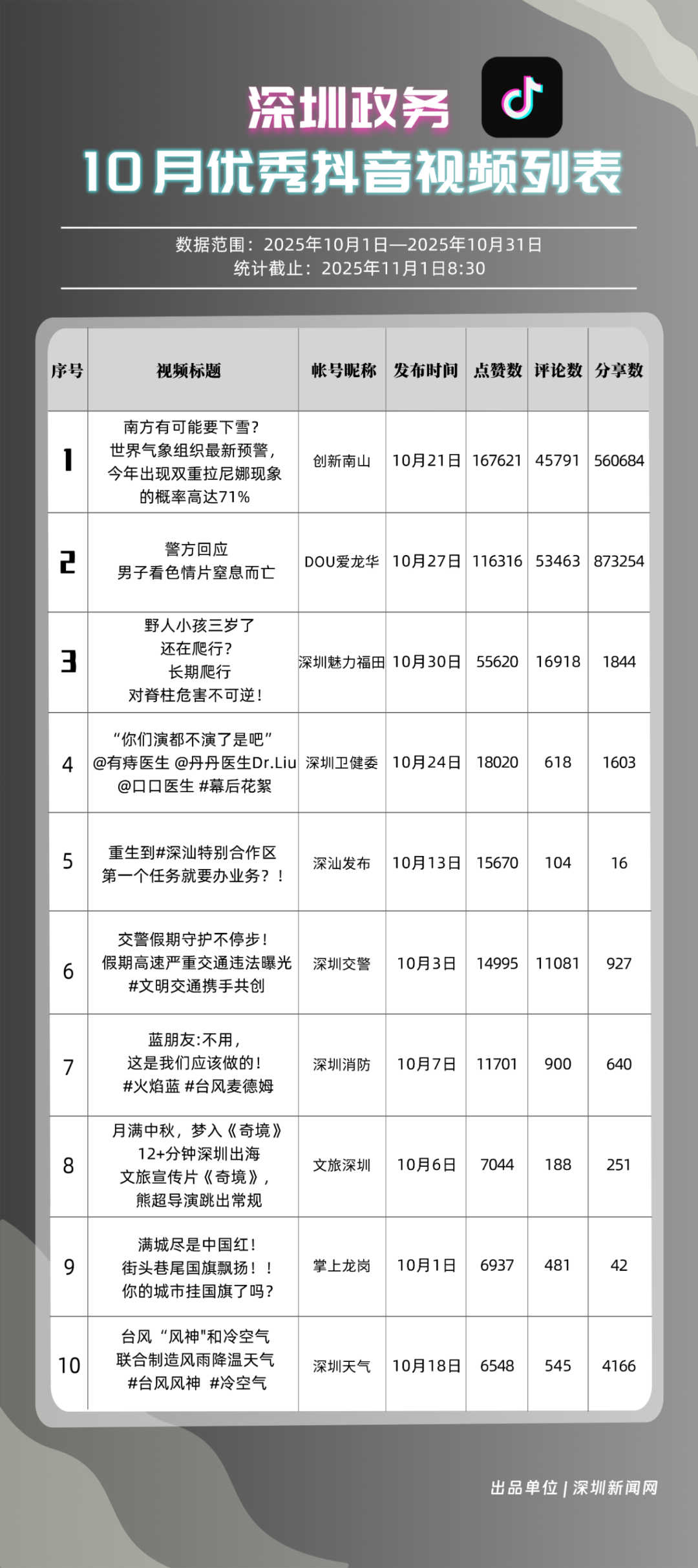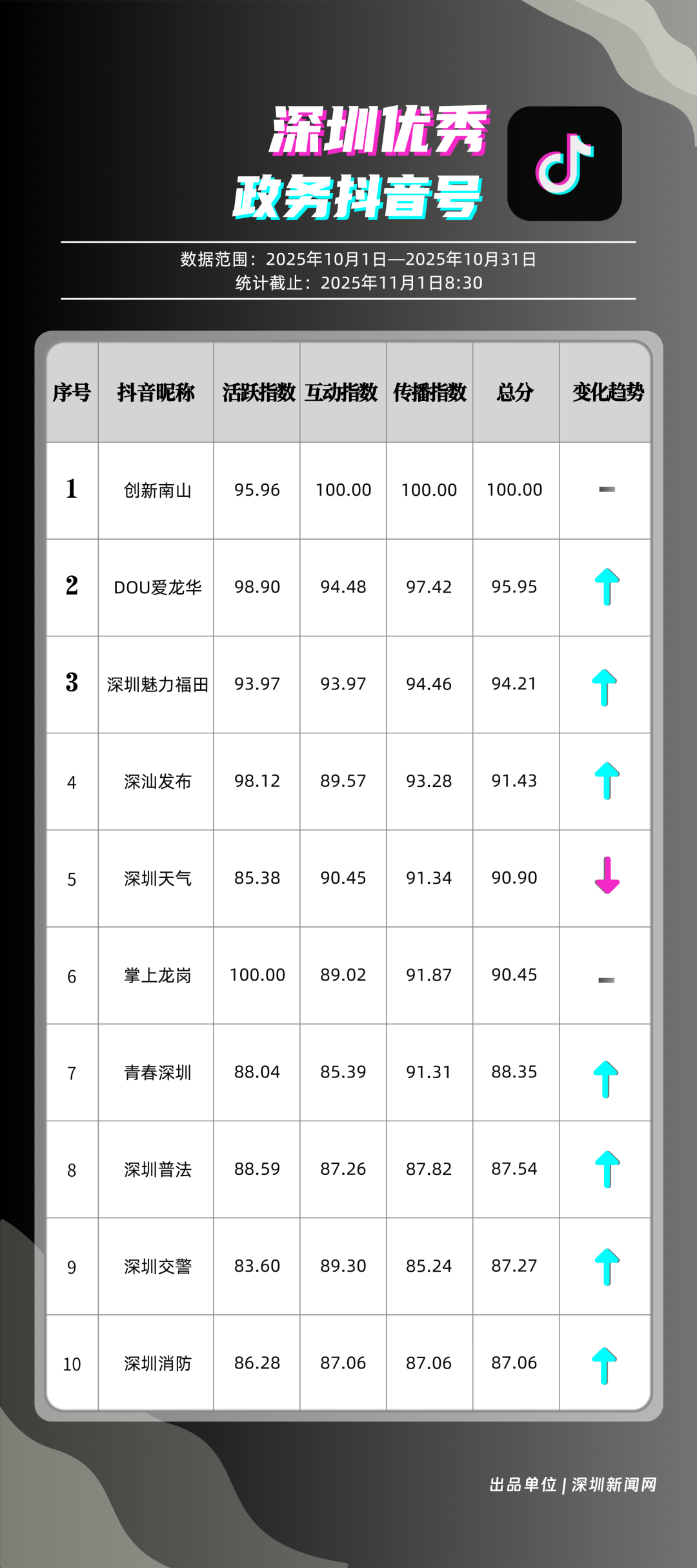 10月,獲得“優(yōu)秀政務抖音號”稱號的是“創(chuàng)新南山”“DOU愛龍華”“深圳魅力福田”“深汕發(fā)布”“深圳天氣”“掌上龍崗”“青春深圳”“深圳普法”“深圳交警”“深圳消防”?!皠?chuàng)新南山”以總分100分居于榜首,展現(xiàn)出其內(nèi)容創(chuàng)作對用戶的強大吸引力與傳播力;“DOU愛龍華”與“深圳魅力福田”分別位列第二、三位,得分在95分左右,排名較上期有所上升?!吧钌前l(fā)布”“深圳天氣”“掌上龍崗”等賬號得分均在90分以上,以年輕化表達展示實用信息,也收獲較好互動、傳播成績。