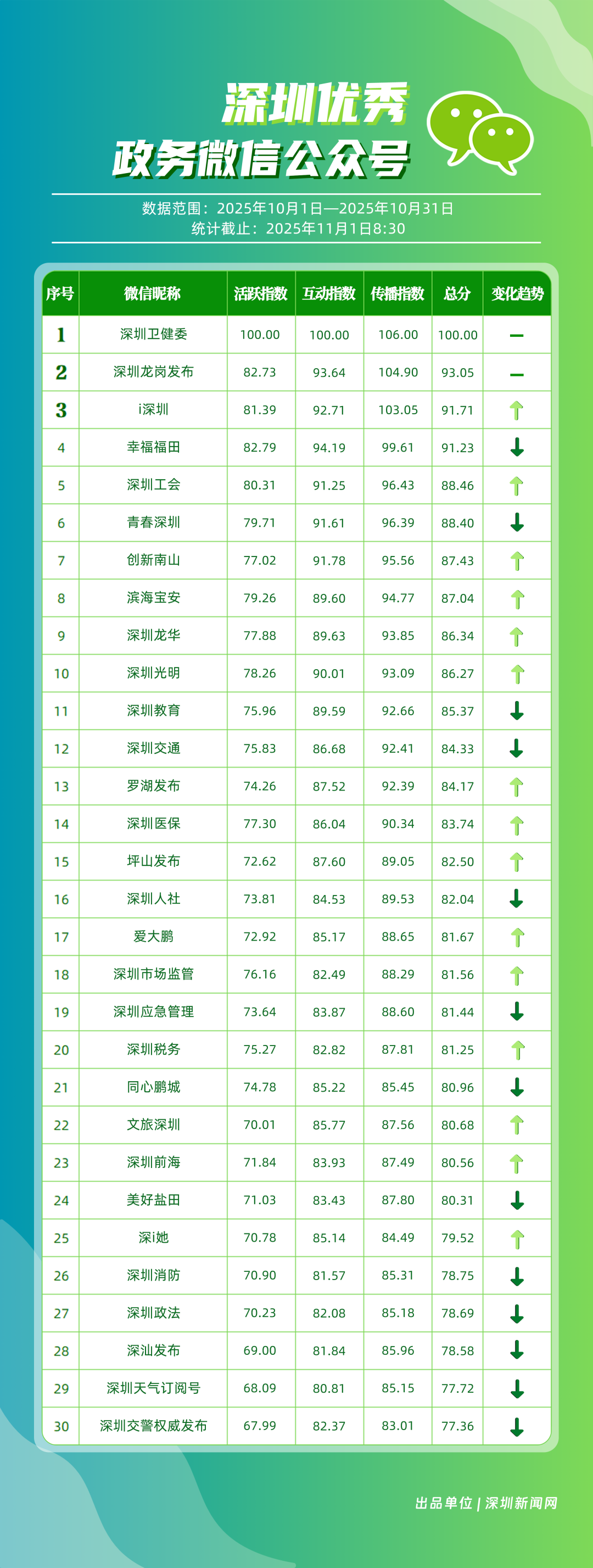 10月,“深圳衛(wèi)健委”“深圳龍崗發(fā)布”“i深圳”“幸福福田”“深圳工會”“青春深圳”“創(chuàng)新南山”“濱海寶安”“深圳龍華”“深圳光明”等30個政務微信公眾號榮登“深圳優(yōu)秀政務微信公眾號”榜單。10月,“深圳衛(wèi)健委”以總分100位居榜首,其持續(xù)以真誠、反套路的內(nèi)容,將專業(yè)健康知識轉化為網(wǎng)民喜聞樂見的“生活指南”,受到大量網(wǎng)民喜愛;“深圳龍崗發(fā)布”位居第二,持續(xù)發(fā)布高質(zhì)量內(nèi)容,成為市民獲取龍崗動態(tài)的“第一窗口”;“i深圳”也發(fā)布政策、民生內(nèi)容,排名有所上升,位列第三;“幸福福田”“深圳工會”等也立足區(qū)域特色,通過多元內(nèi)容,展現(xiàn)各自的發(fā)展活力。
